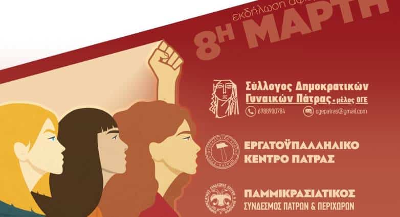 Ο Σύλλογος Δημοκρατικών Γυναικών Πάτρας (μέλος της ΟΓΕ), το Εργατοϋπαλληλικό Κέντρο Πάτρας και ο Παμμικρασιατικός Σύνδεσμος Πατρών και Περιχώρων θα πραγματοποιήσουν εκδήλωση αφιερωμένη στην 8η Μάρτη, το Σάββατο 15 Μάρτη στις 7:00μμ στον Παμμικρασιατικό Σύνδεσμο Πατρών και Περιχώρων (Φωκαίας 26).