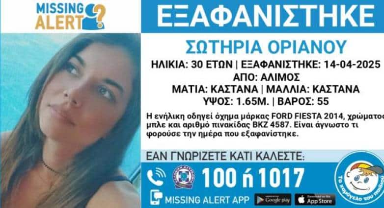 Συναγερμός έχει σημάνει στις αρχές μετά την εξαφάνιση της 30χρονης Σωτηρίας Οριανού από τον Άλιμο.