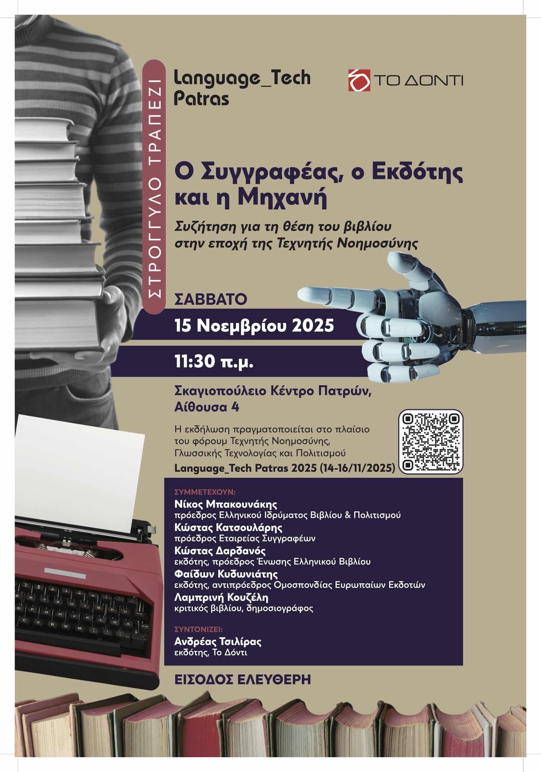 Οι εκδόσεις Το Δόντι διοργανώνουν το Σάββατο 15 Νοεμβρίου 2025, ώρα 11:30 π.μ. στο Σκαγιοπούλειο Κέντρο Πατρών στρογγυλό τραπέζι με θέμα «Ο Συγγραφέας, ο Εκδότης και η Μηχανή» για τη θέση και το μέλλον του βιβλίου στην εποχή της Τεχνητής Νοημοσύνης. Στόχος είναι να συζητήσουμε τις προκλήσεις και τις ευκαιρίες που φέρνει η νέα εποχή: από τα πνευματικά δικαιώματα και τη δημιουργία πρωτότυπων έργων, μέχρι τον ρόλο του ανθρώπου στη λογοτεχνική και εκδοτική παραγωγή του μέλλοντος.