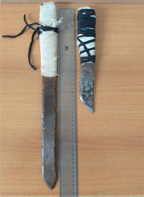 Κατά τη διάρκεια της έρευνας βρέθηκαν (2) αυτοσχέδια μαχαίρια 44 & 26 εκατοστών αντίστοιχα και 30 λίτρα αυτοσχέδιου αλκοολούχου ποτού.