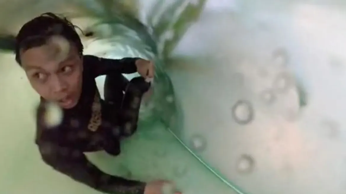 Λίγο παρακάτω, όμως, για δεύτερη φορά ο Μαλαισιανός κόλλησε με αποτέλεσμα αρχικά ο ίδιος να καλεί σε βοήθεια και να προσπαθεί να συρθεί προς κάποια έξοδο και τελικά έναν υπάλληλο να ανοίγει την νεροτσουλήθρα και να τον απεγκλωβίζει.
