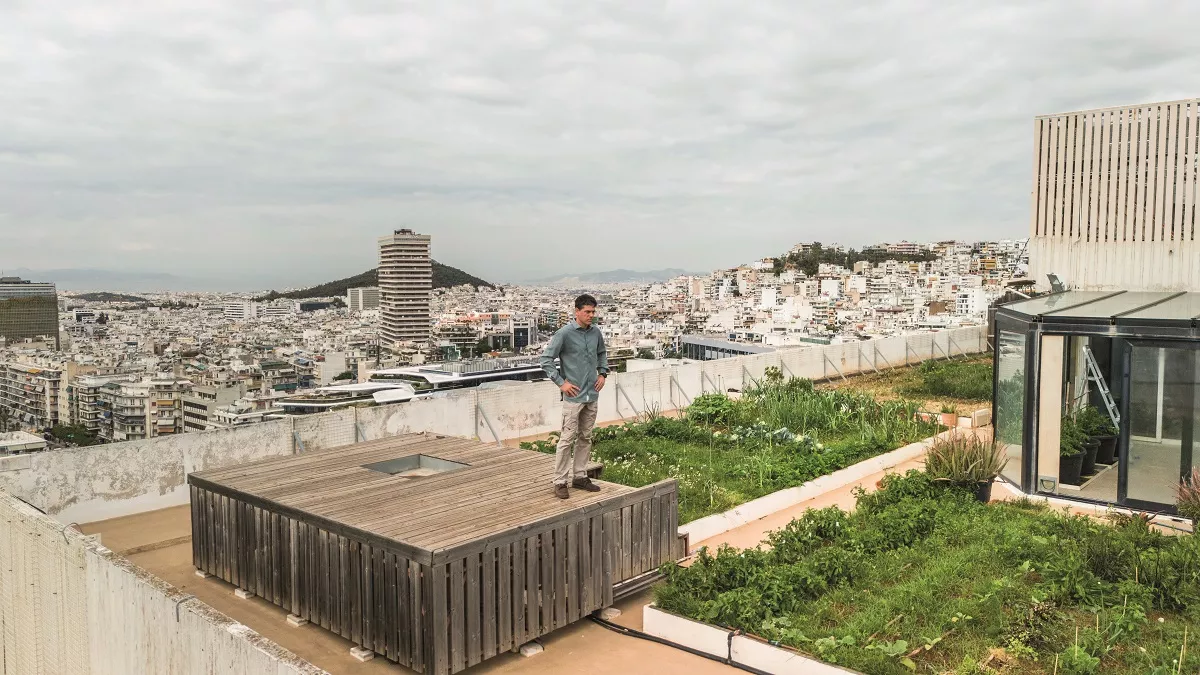 Ανεβαίνοντας στην ταράτσα βλέπεις στα πόδια σου όλη την Αθήνα, το βλέμμα σου φτάνει μέχρι Λυκαβηττό και στο βάθος φαίνεται η θάλασσα. Ωστόσο το μικρό θαύμα βρίσκεται μπροστά σου, στα παρτέρια που καλύπτουν μεγάλο τμήμα της. Είδαμε κάποιες πράσινες -ακόμη- ντομάτες, μικρά κολοκυθάκια, αγγουράκια, φρέσκα κρεμμυδάκια, αλλά και τα τελευταία λάχανα του χειμώνα. Υπάρχει και ένα μικρό θερμοκήπιο που το χρησιμοποιεί ενίοτε για να έχει μεγαλύτερη παραγωγή. «Όταν τελειώνει μια περίοδος, το ξεπατώνεις το “χωράφι”, καθώς τα φυτά έχουν απορροφήσει όλα τα θρεπτικά συστατικά του και χρειάζεται να ανανεωθεί το χώμα, να προστεθούν νέα μαζί με ιχνοστοιχεία, για να φυτευτούν στη συνέχεια άλλα οπωροκηπευτικά».