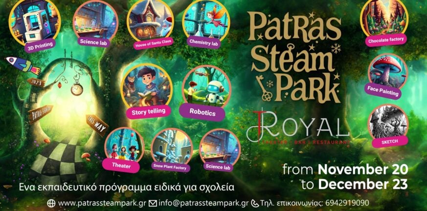 Στο Χριστουγεννιάτικο PATRAS STEAM PARK τα παιδιά των Δημοτικών και Γυμνασίων θα έχουν την ευκαιρία να ζήσουν και να απολαύσουν μια μοναδική Χριστουγεννιάτικη εμπειρία μέσα από τις Επιστήμες, την Τεχνολογία, τις Τέχνες και την Καινοτομία, συμμετέχοντας σε ένα εορταστικό διαδραστικό εκπαιδευτικό πρόγραμμα ανάπτυξης δεξιοτήτων διάρκειας 3 ωρών (09:00-13:00).