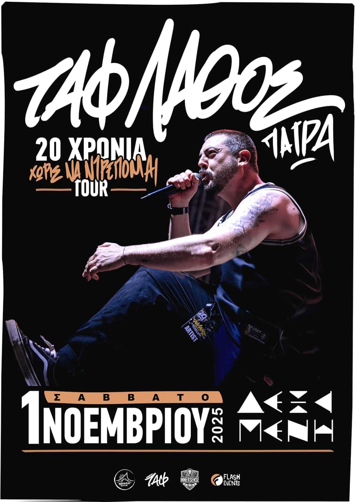 Μετά το καταπληκτικό Live στην Τεχνόπολη τον Ιούλιο, την παρουσία στα καλοκαιρινά φεστιβάλ και Stages και το Sold Out Live στην Αθήνα τον Σεπτέμβριο, ο ΤΑΦ ΛΑΘΟΣ με τον Dj Micro στα Decks και Special Guests στα μικρόφωνα, παρουσιάζουν ζωντανά τον νέο δίσκο “Χωρίς Να Ντρέπομαι” γιορτάζοντας παράλληλα τα 20 Χρόνια δισκογραφίας του ΤΑΦ ΛΑΘΟΣ στην ανεξάρτητη Ελληνική μουσική σκηνή.
