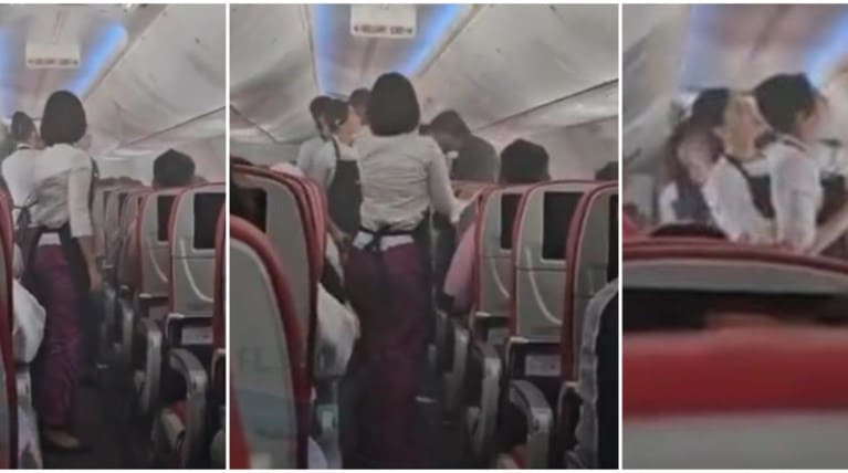 Οι αεροσυνοδοί καταγράφονται να ελέγχουν τους χώρους των αποσκευών αναζητώντας την πηγή του καπνού, ενώ οι επιβάτες που βρίσκονται στο μέρος της καμπίνας που έχει γεμίσει καπνό φαίνονται να εγκαταλείπουν τις θέσεις τους πριν οι αεροσυνοδοί εντοπίσουν το φλεγόμενο power bank και σβήσουν τη φωτιά χρησιμοποιώντας έναν πυροσβεστήρα.