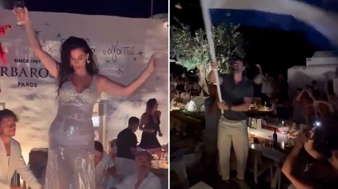 Όπως φαίνεται στα βίντεο που ανήρτησε η Instagrammer, ανέβηκε πάνω στο τραπέζι για να χορέψει στους ρυθμούς του Pretty Woman με τον σύζυγό της, Σάκη Τανιμανίδη, να τραγουδάει.