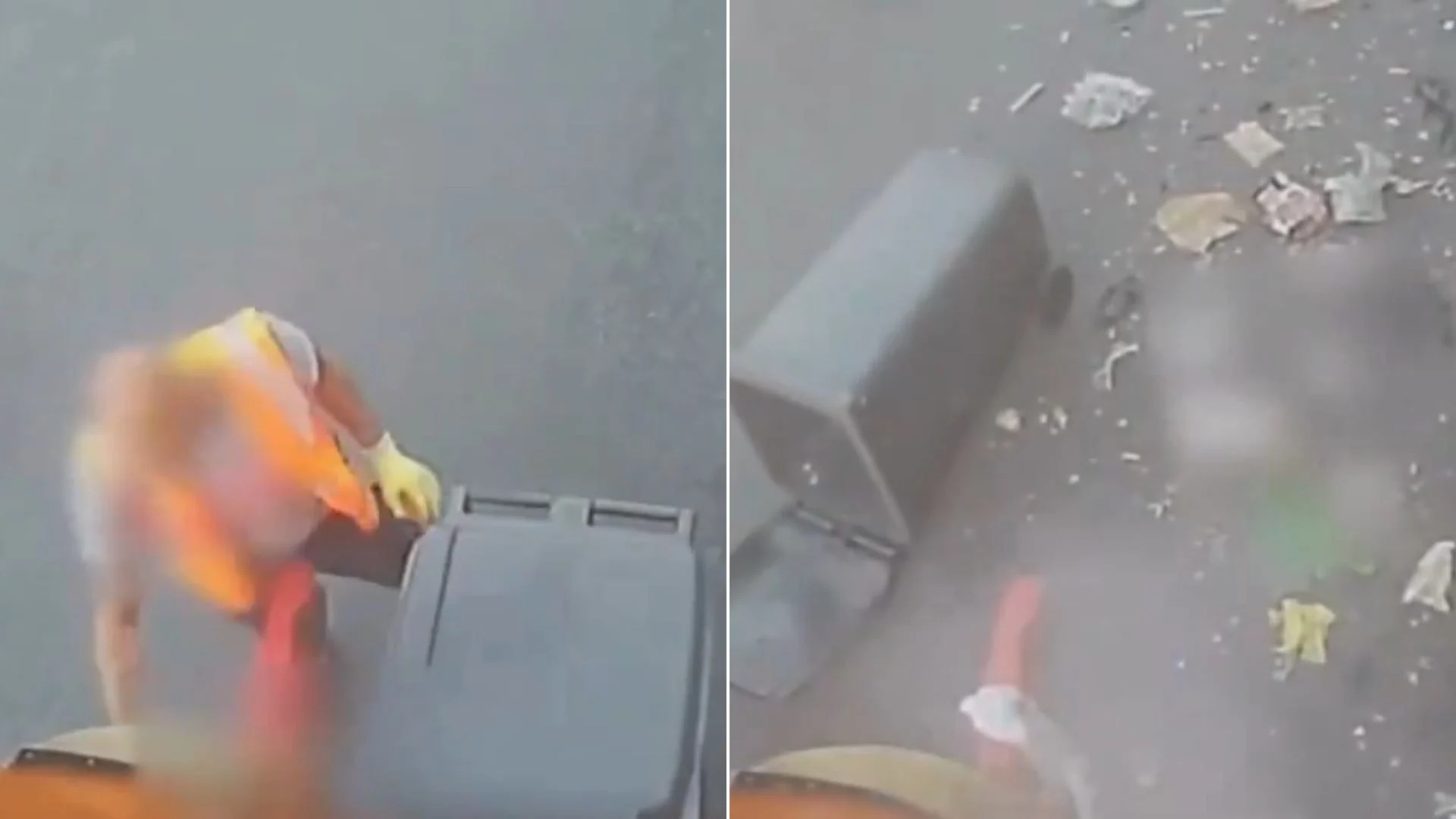 Συγκλονιστικό βίντεο καταγράφει τη στιγμή που δύο Βρετανοί υπάλληλοι καθαριότητας γλίτωσαν από θαύμα τον τραυματισμό τους όταν ένας κάδος απορριμμάτων εξερράγη κατά τη διάρκεια της περισυλλογής.