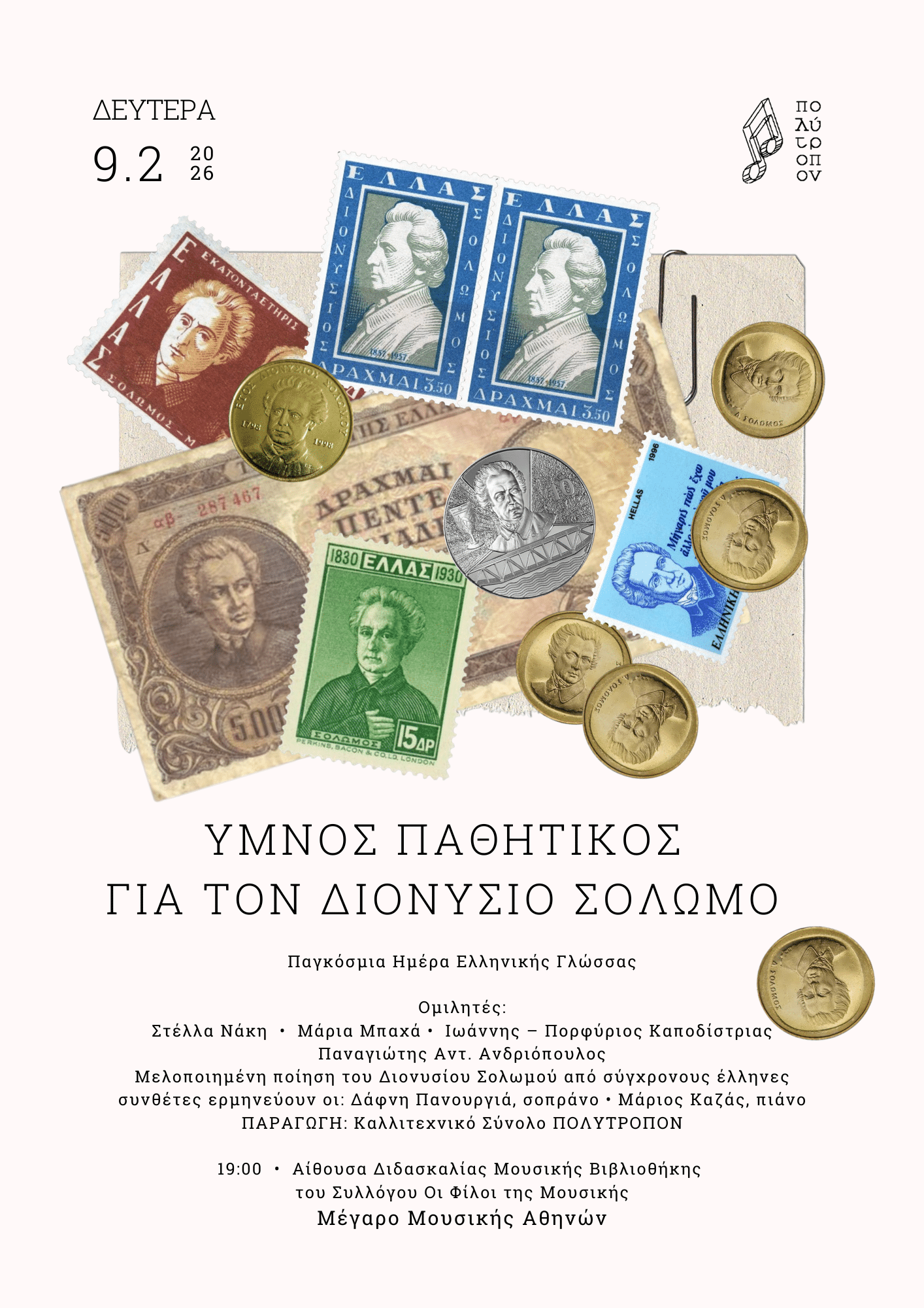 Το Καλλιτεχνικό Σύνολο «Πολύτροπον» (υπεύθυνος: Παναγιώτης Αντ. Ανδριόπουλος), παρουσιάζει την εκδήλωση με τίτλο: «Ύμνος Παθητικός για τον Διονύσιο Σολωμό», την Δευτέρα 9 Φεβρουαρίου 2026 και ώρα 7 μ.μ., στην Αίθουσα Διδασκαλίας της Μουσικής Βιβλιοθήκης του Συλλόγου «Οι Φίλοι της Μουσικής», στο Μέγαρο Μουσικής Αθηνών.